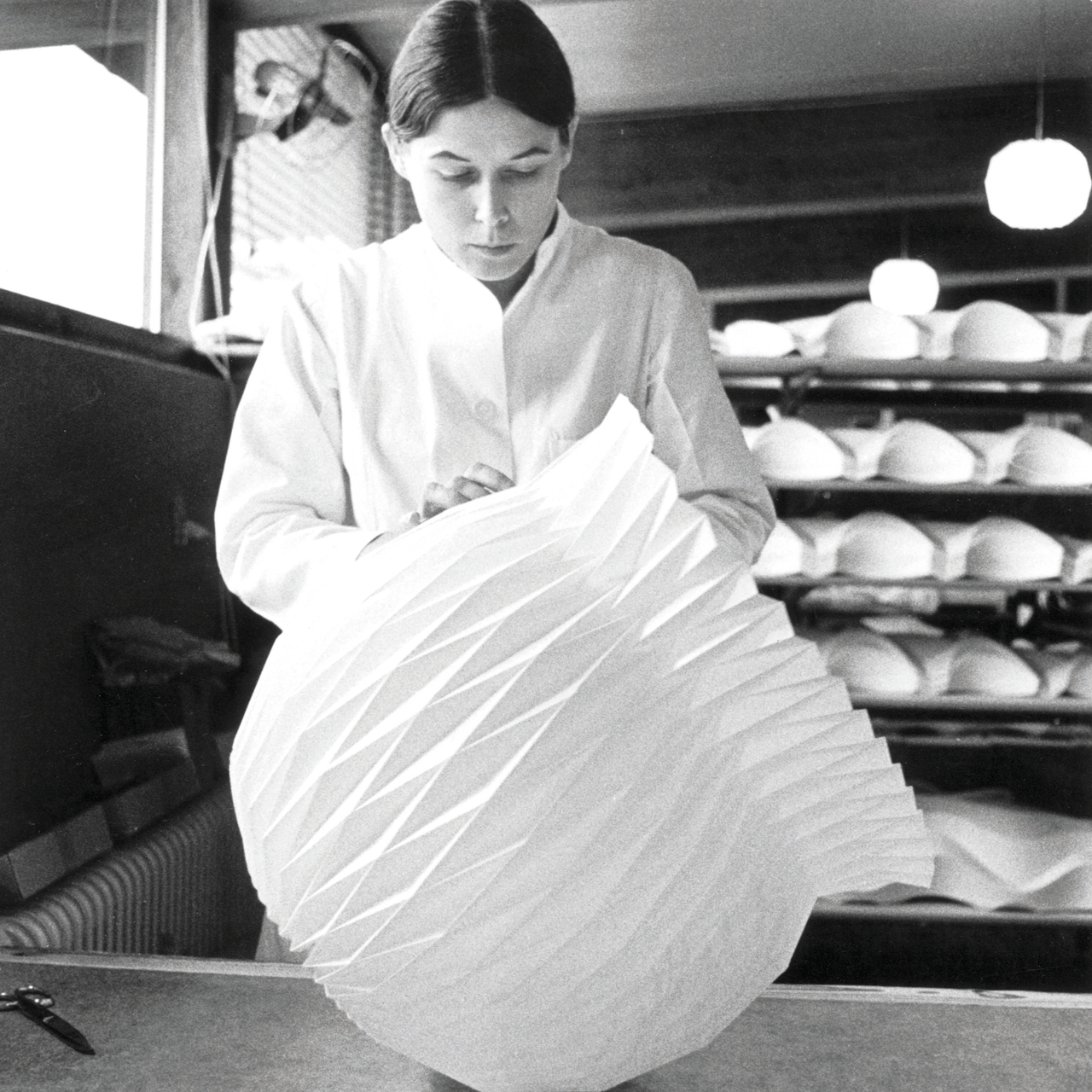 Den karakteristiske, håndfoldede skjermen produseres i Odense av våre dyktige håndverkere og finnes i to varianter: papir for et varmt og stemningsfullt lys eller standardfolie, som er enkel å rengjøre.